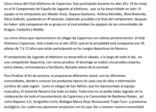 Los pasados días 18 y 19 de mayo se celebró en Jaén el IX Campeonato Nacional de Atletismo "Jugando al Atletismo" al cual acudieron las caparrosinas Andrea Reinaldo, Elena Galindo, Maider Araiz, Dayana Gavilanes y Silvia Redondo, para representar al equipo femenino de Navarra. Tras quedar primeras de grupo, accedieron a la final obteniendo un cuarto puesto. La noticia completa ha sido facilitada por el propio club de atletismo. Adjuntamos también fotografías del campeonato.